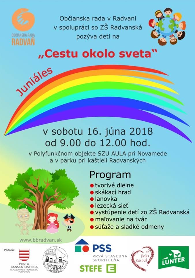 Pozývame Vás na Cestu okolo sveta. Príďte zažiť dobrodružstvo, vystúpenia detí zo ZŠ Radvaň, tvorivé dielne, skákací hrad, lanovku, maľovanie na tvár a súťaže. Tešíme sa na Vás v sobotu 16. júna od 9,00 do 12,00 hod v priestoroch SZU a v parku pri kaštieli Radvanských.